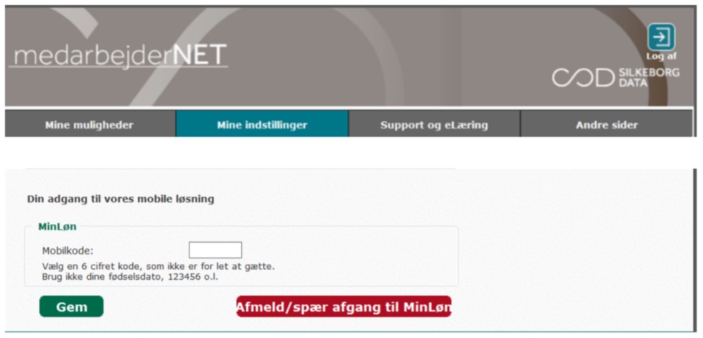 Inden du kan bruge appen, skal du oprette dig på Medarbejdernet.dk. Du skal bruge MitID for at logge ind. Du skal oprette en 6 cifret kode, som du fremover skal bruge sammen med dit CPR-nummer, når du logger på appen. Koden opretter du under "Mine Indstillinger".