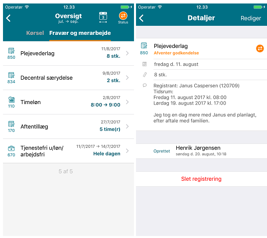 Vil du redigere, tjekke status eller se historik på en indberetning i MinLøn App, finder du den nemmest i MinLøn Oversigt. Trykker du på indberetningen, får du vist et detaljeret billede, hvor alle informationerne (barnets navn, tidsrum og eventuel kommentar) vises samlet.