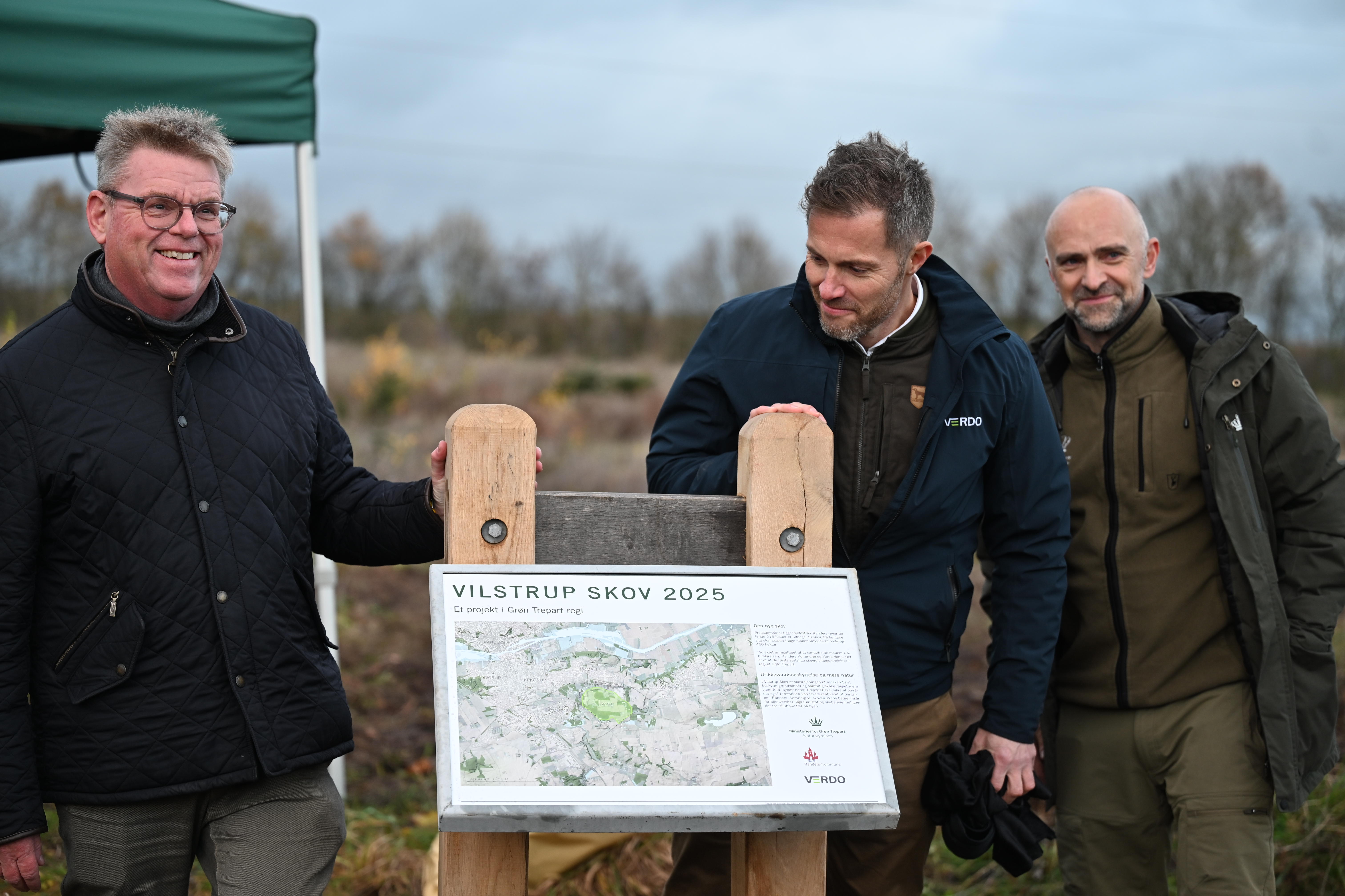 Randers Kommune, Verdo Vand og Naturstyrelsen etablerer i fællesskab Vilstrup skov - en investering i natur, klima og fremtidens drikkevand. I dag blev de første træer plantet, og arbejdet med den nye bynære skov er officielt sat i gang.