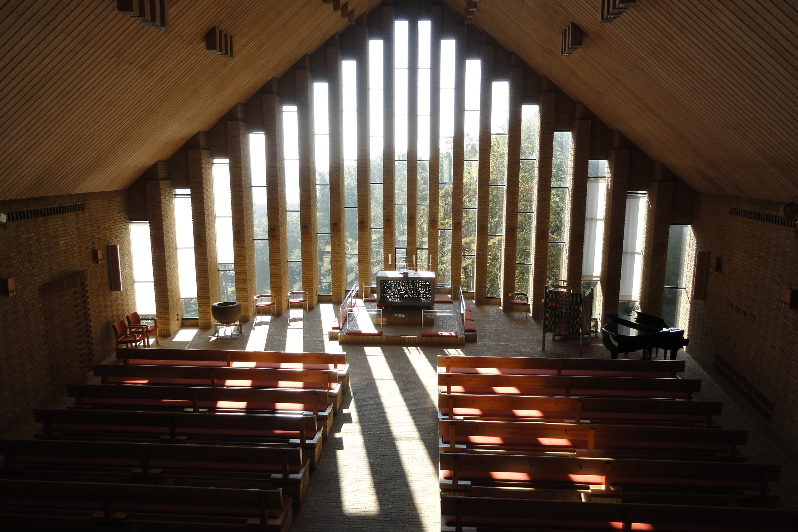 Selve kirkerummet er femkantet, således at korpartiet med de 17 murpiller og vinduerne fra loft til gulv ender i en spids. Når man kommer ind i kirkerummet åbner kirken sig op mod Vestparken. Verdenen og himlen er Sct. Clemens kirkes altertavle.